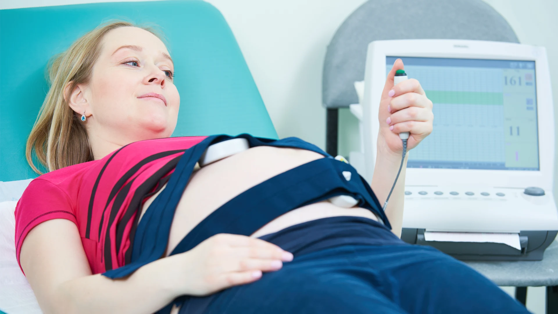 Sensores externos são fixados na barriga da gestante. Um deles capta os batimentos cardíacos do bebê, enquanto o outro registra as contrações uterinas. Essas informações são exibidas em um gráfico que será analisado pelo médico.